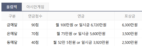 1 韓国ではオリンピックで選手がメダルを取ると一生年金がもらえる