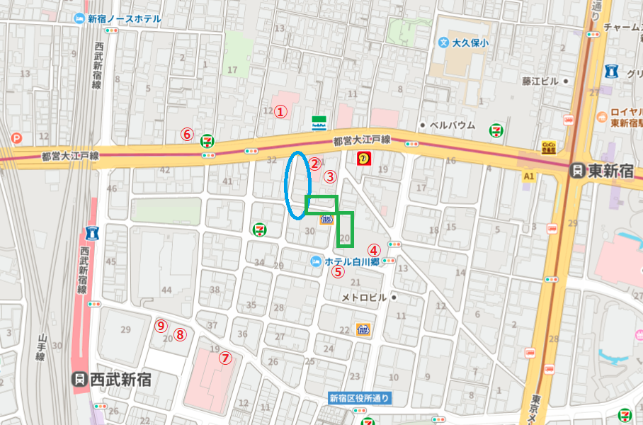 地図の緑の□の場所は値段が下がりました。職安通りから少し中に入りましょう。