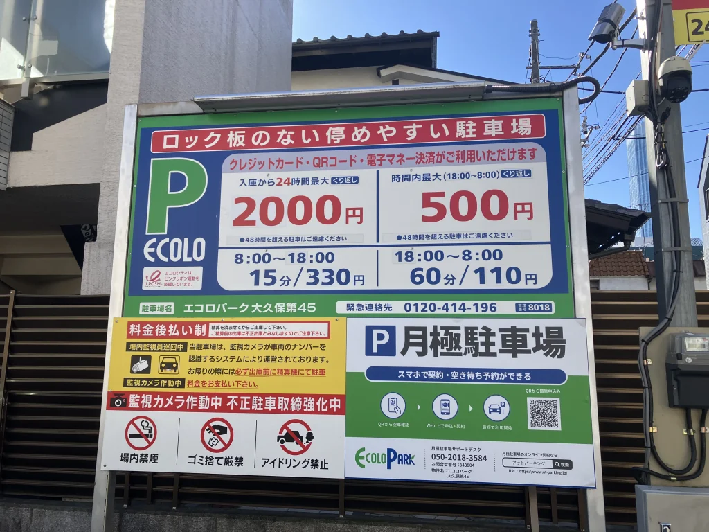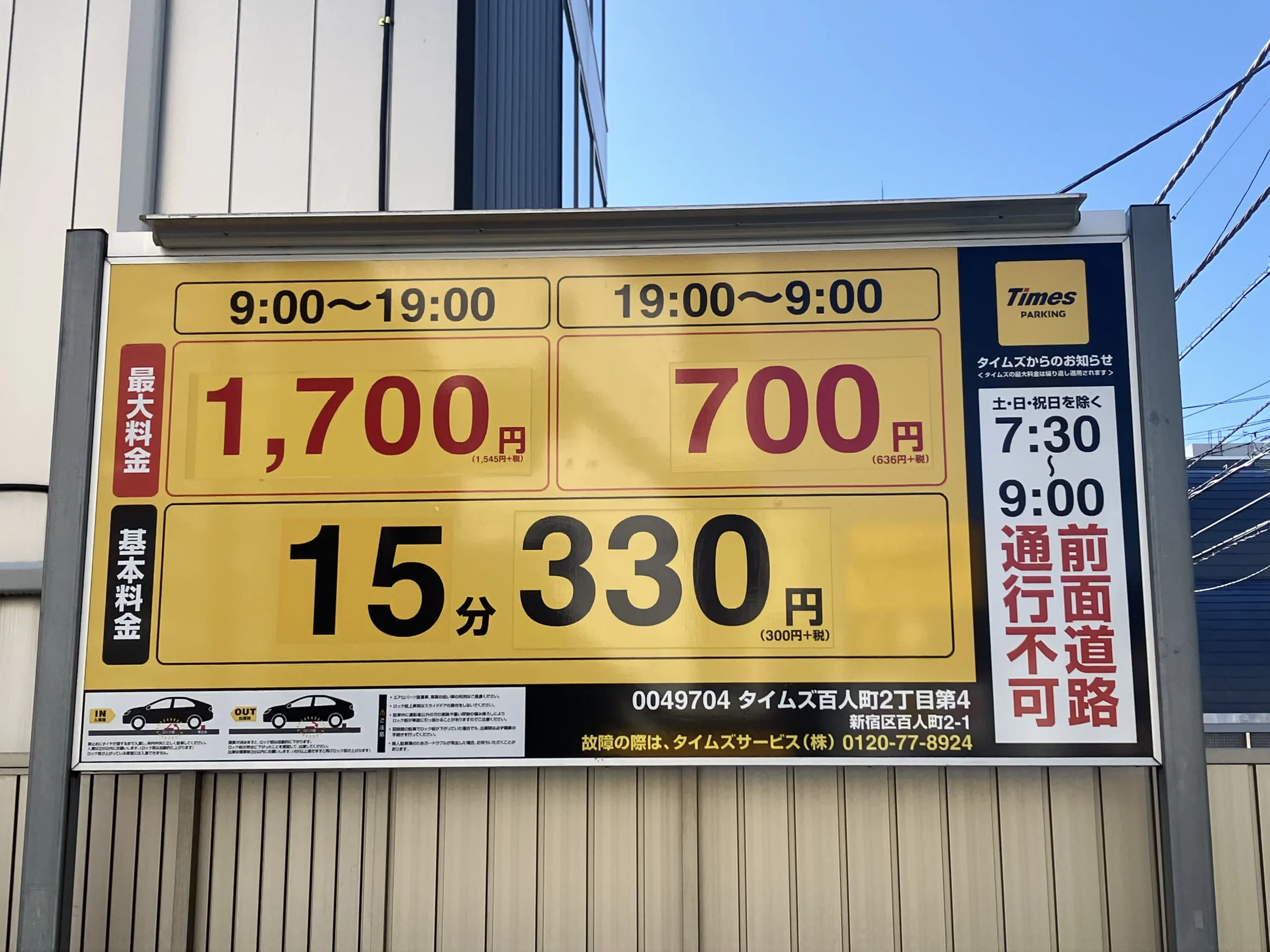 値段がまた上がりました。大久保通り沿いは駐車場自体が少ないため、細い路地を入る駐車場でも値段設定強気です。