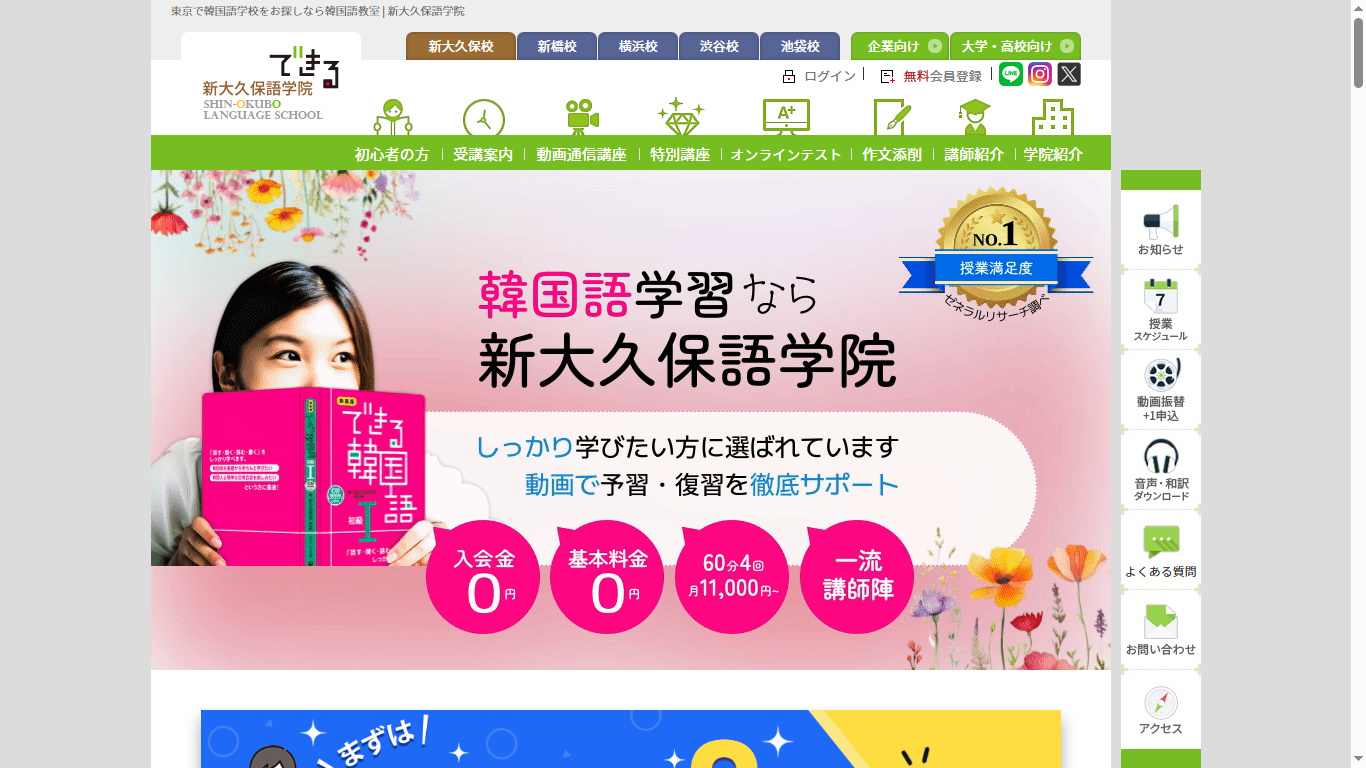 新大久保語学院は、新大久保駅から徒歩1分という好立地にあり、初心者から上級者まで幅広いレベルの韓国語コースを提供しています。日常会話を中心とした実践的な講座やTOPIK対策、文化講座、短期集中コースなど多彩なプログラムを展開。講師は経験豊富なネイティブで、学習者の目的に合わせたカリキュラムを提案します。オンラインレッスンも充実しており、忙しい方や遠方の方も通いやすい環境です。移転後の広く快適な学習スペースも魅力で、体験レッスンで授業を確かめられます。